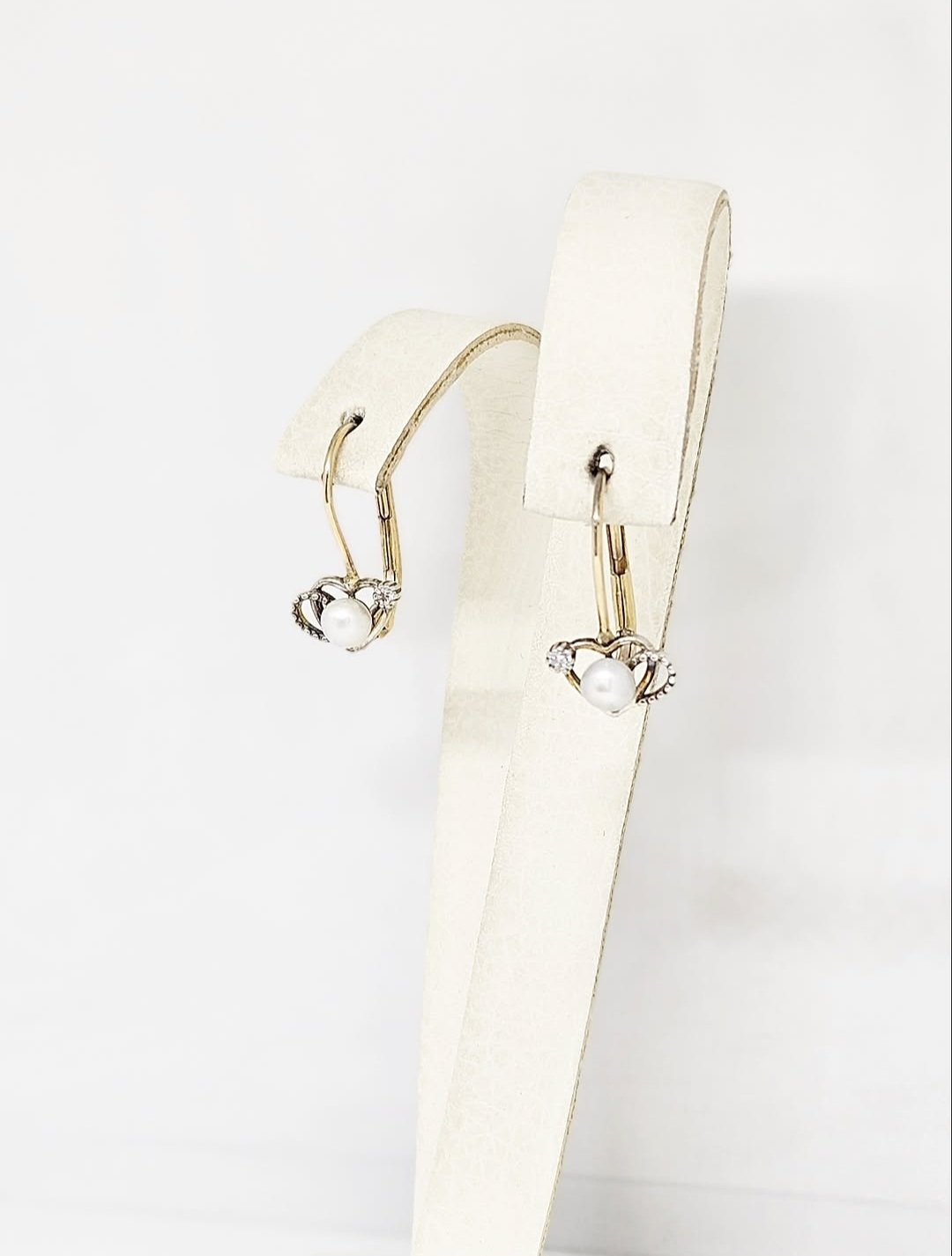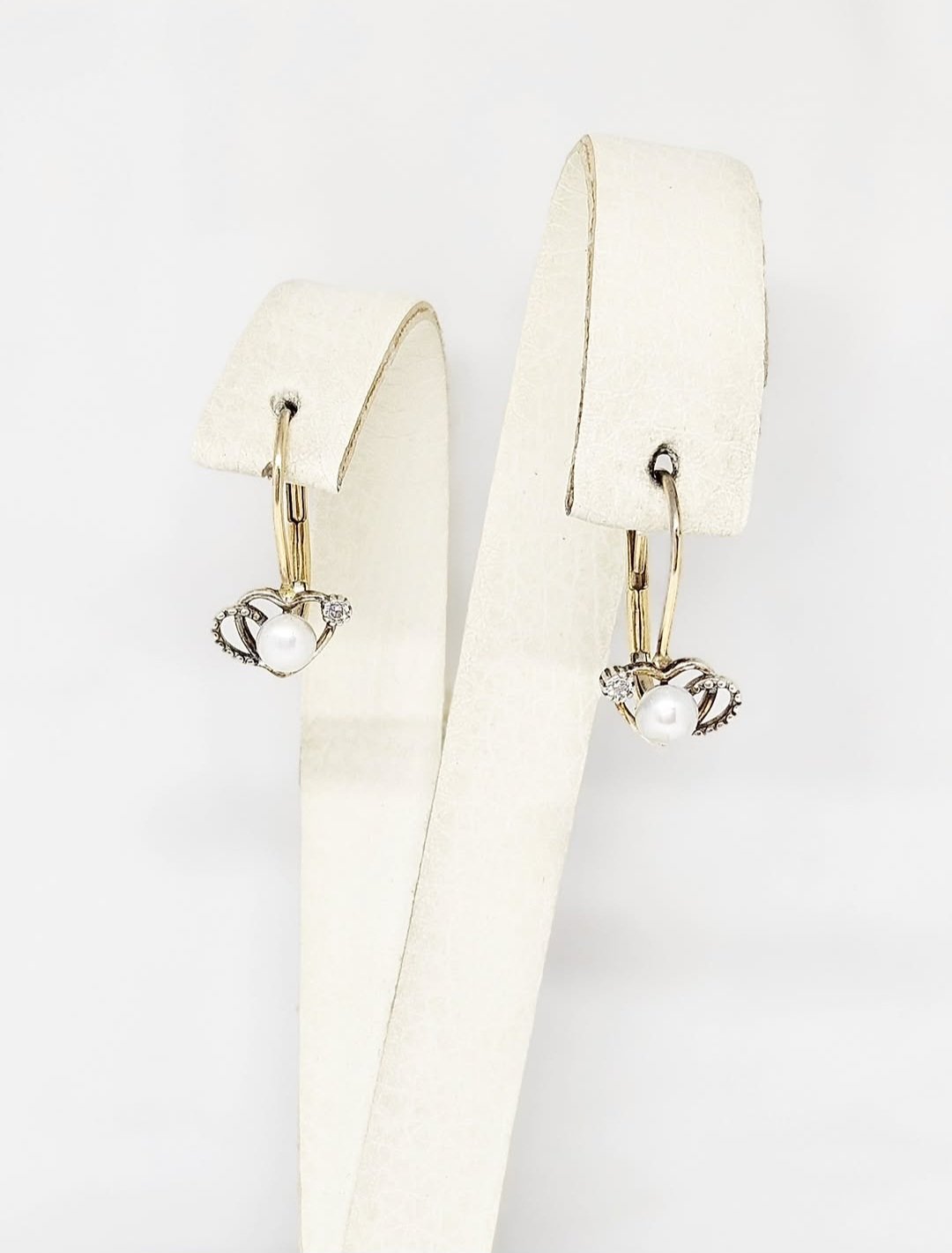 Zlatne naušnice u kombinaciji bijelog i žutog zlata u obliku srca, dodatno oplemenjene biserima – savršen balans modernog dizajna i bezvremenske elegancije.