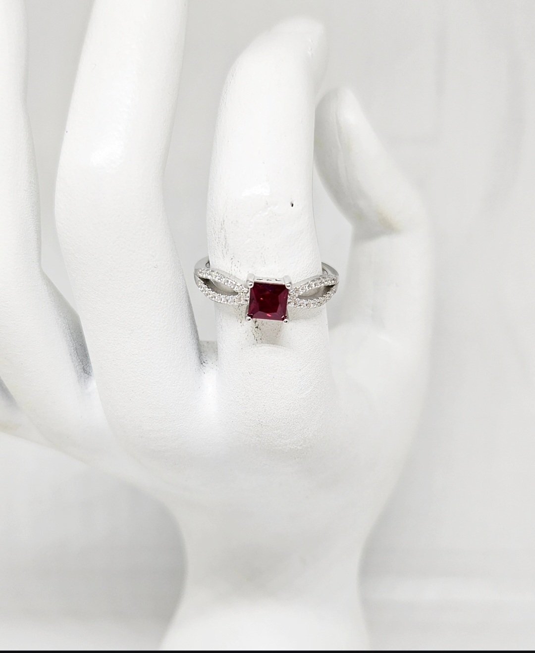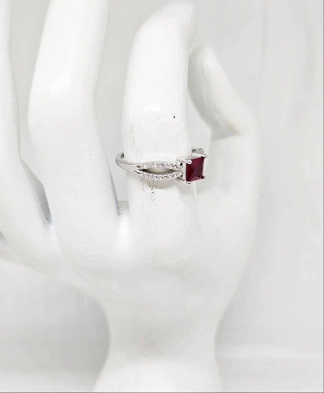 Spoj moderne geometrije i glamura! Prsten od srebra 925 sa upečatljivim crvenim Swarovski kristalom u obliku kocke, dodatno ukrašen sjajnim cirkonima.