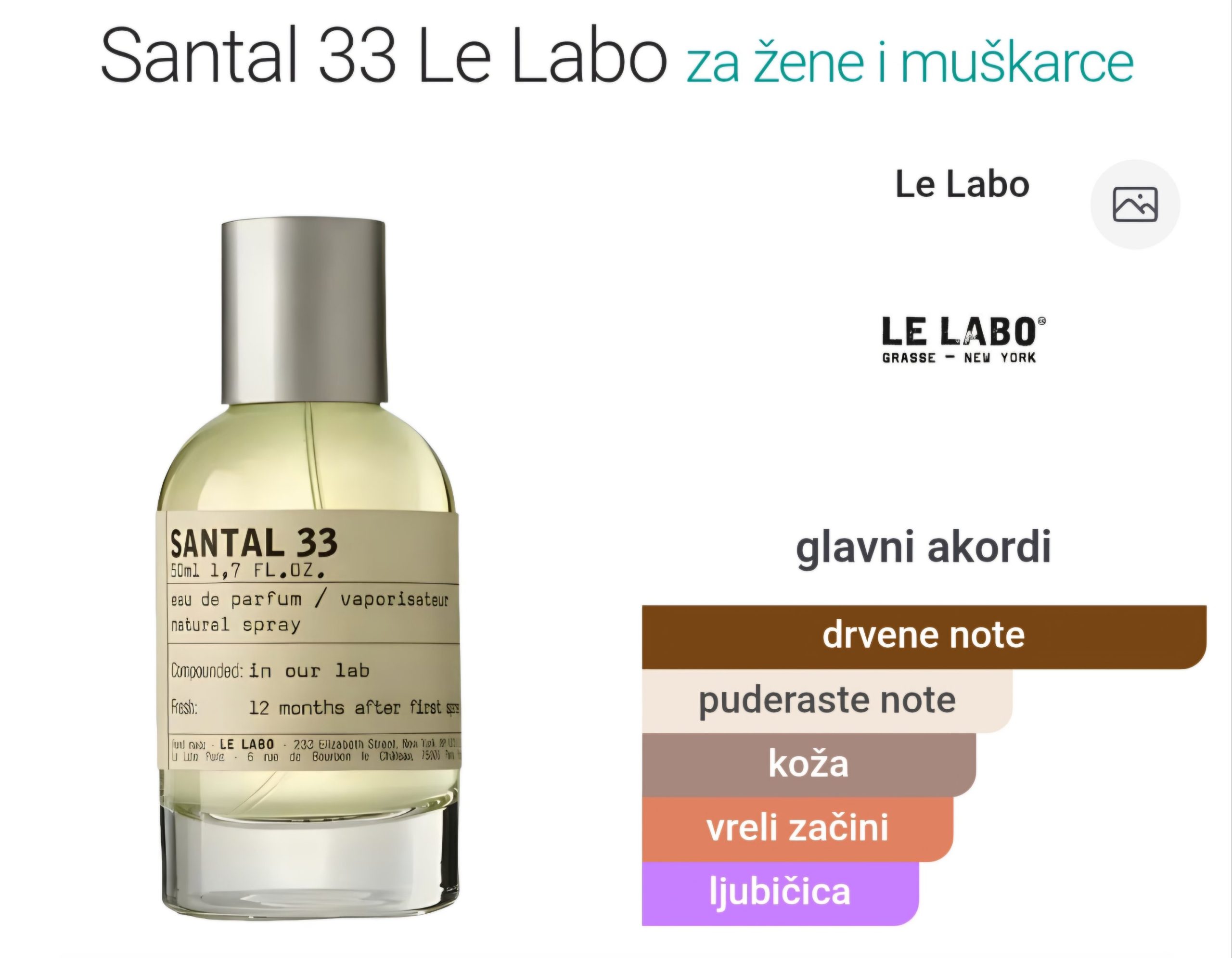 Ikona modernog minimalizma. Santal 33 je suptilan, drvenast i prepoznatljiv miris koji ostavlja čist, sofisticiran trag.